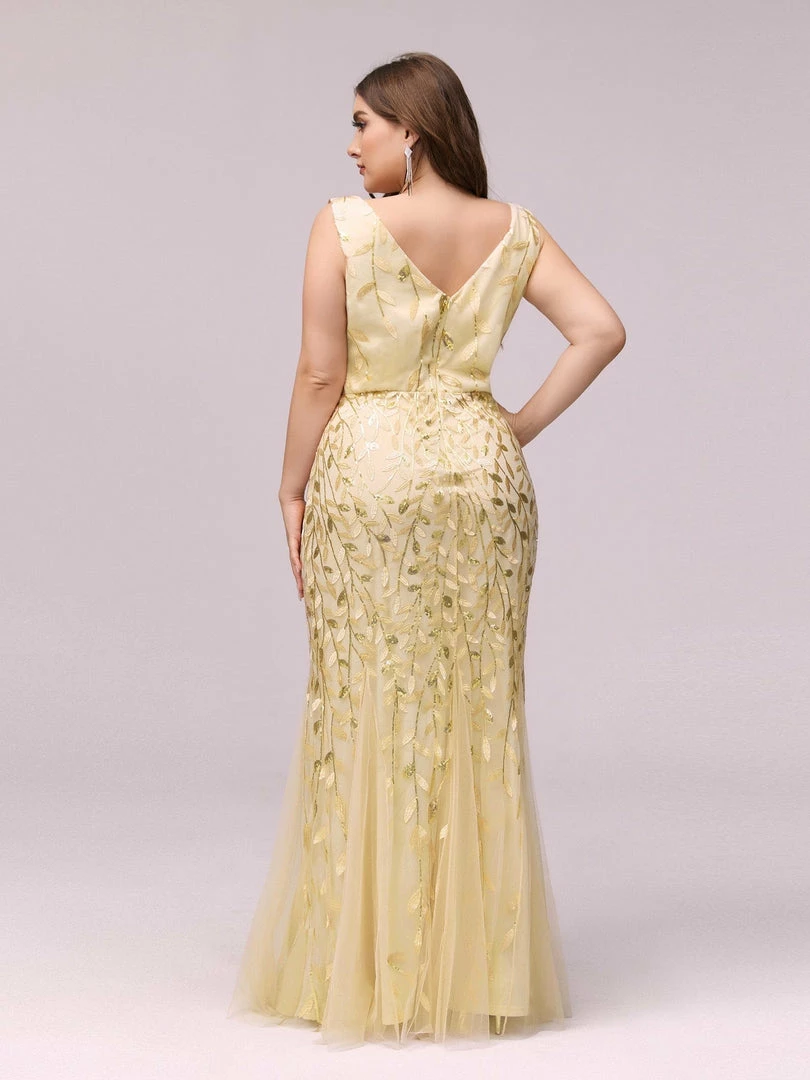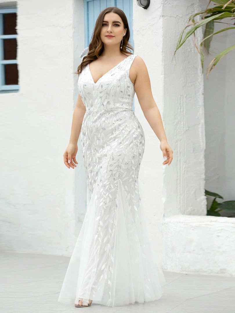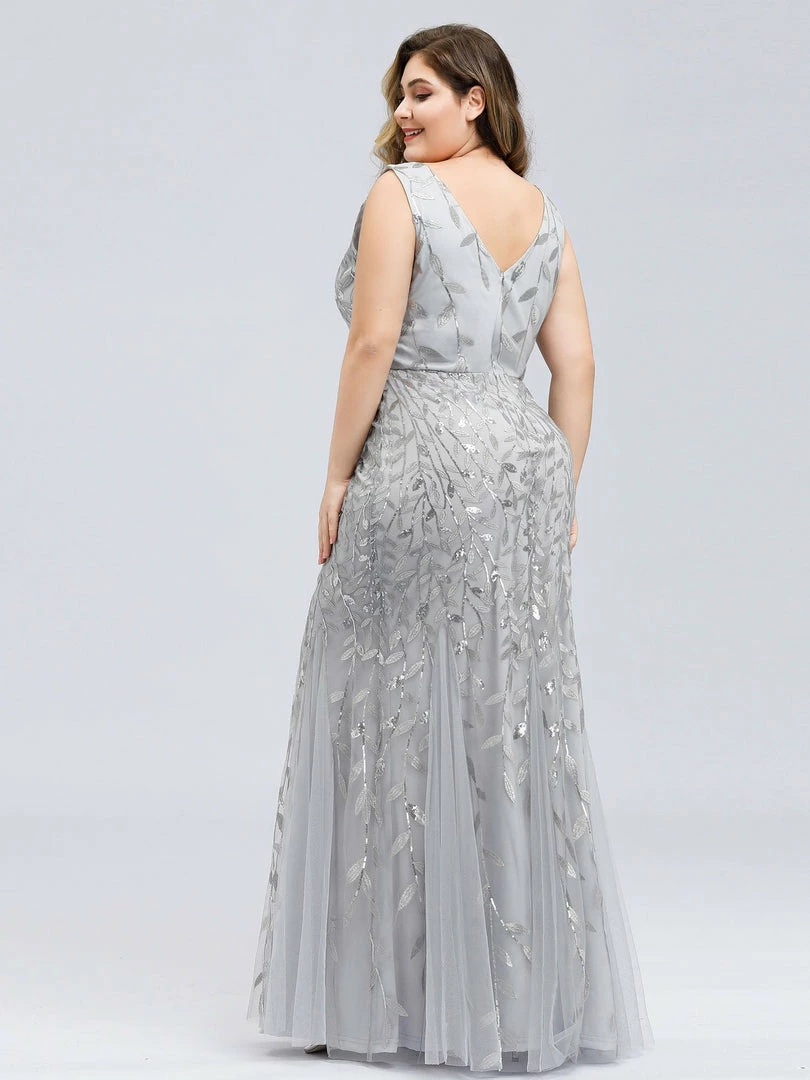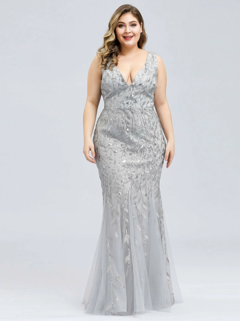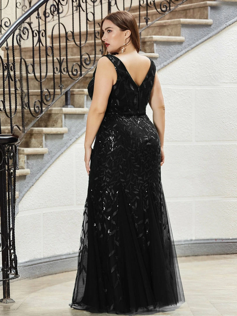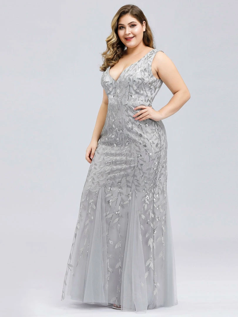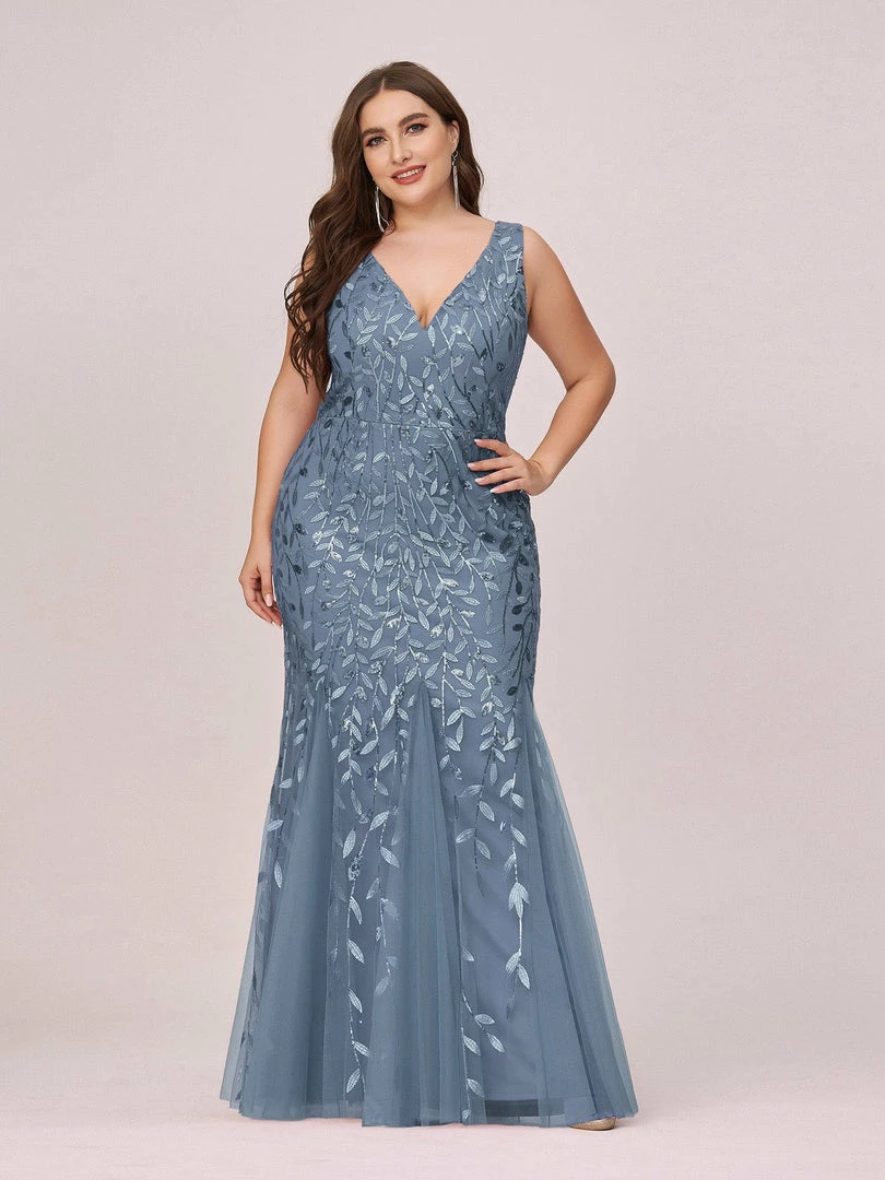 This plus size sequined tulle evening dress features a deep V neckline and fishtail skirt, the shimmery leave design also adds a romantic vibe. It is a perfect choice for people who are looking for an elegant look, but its delicate details add just enough flair to show your taste. Really perfect for evening party, cocktail, prom, homecoming, graduation, weddings, and any other formal affair! Prices will vary as certain colors of this style is on sale.