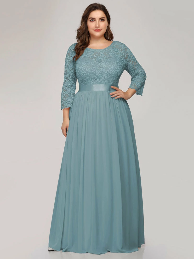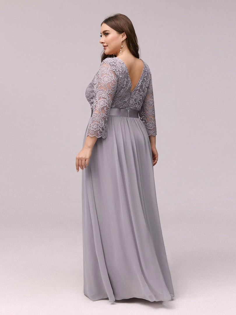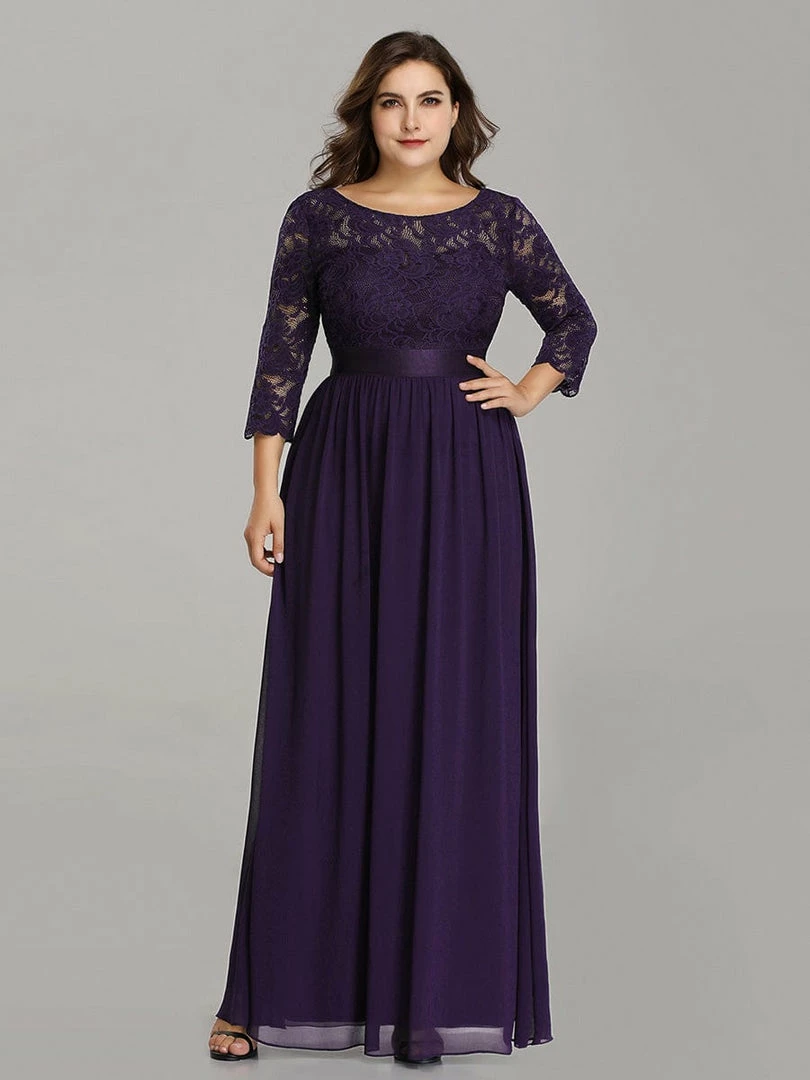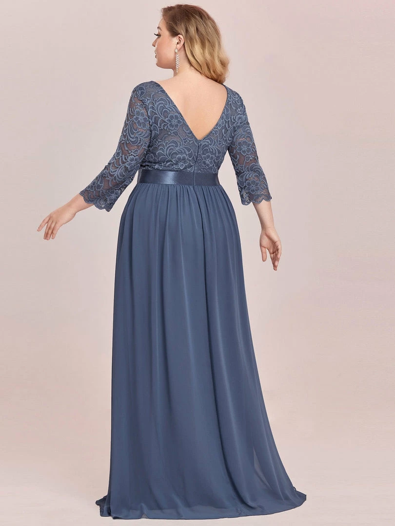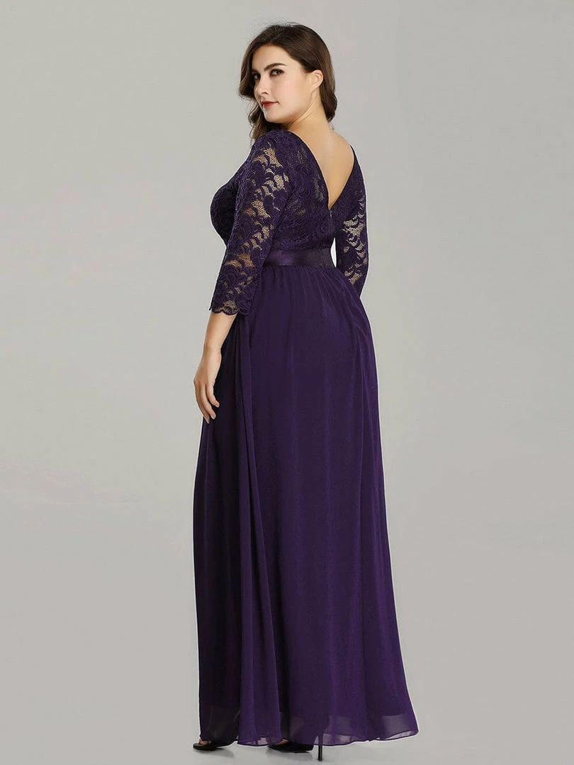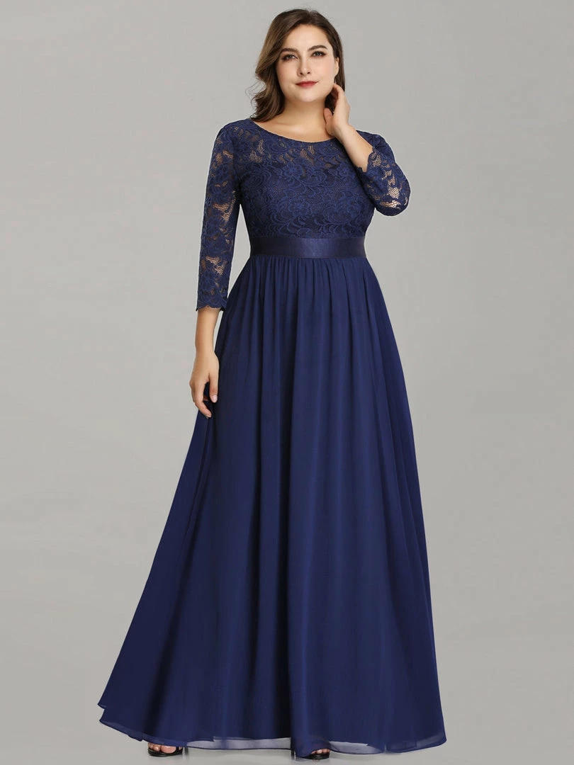 When the occasion calls for a chic and elegant look, go in for this flowing see-through lace evening dress. The long sleeve lace evening gown is amplified because of its lace bodice and sleeves. The floor length lace evening dress is uniquely complemented with a figure-flattering wide ribbon waistband that accentuates the waistline. The romantically designed V-shaped back guarantees a look that will make heads turn upon your arrival at any party, wedding or even your prom.