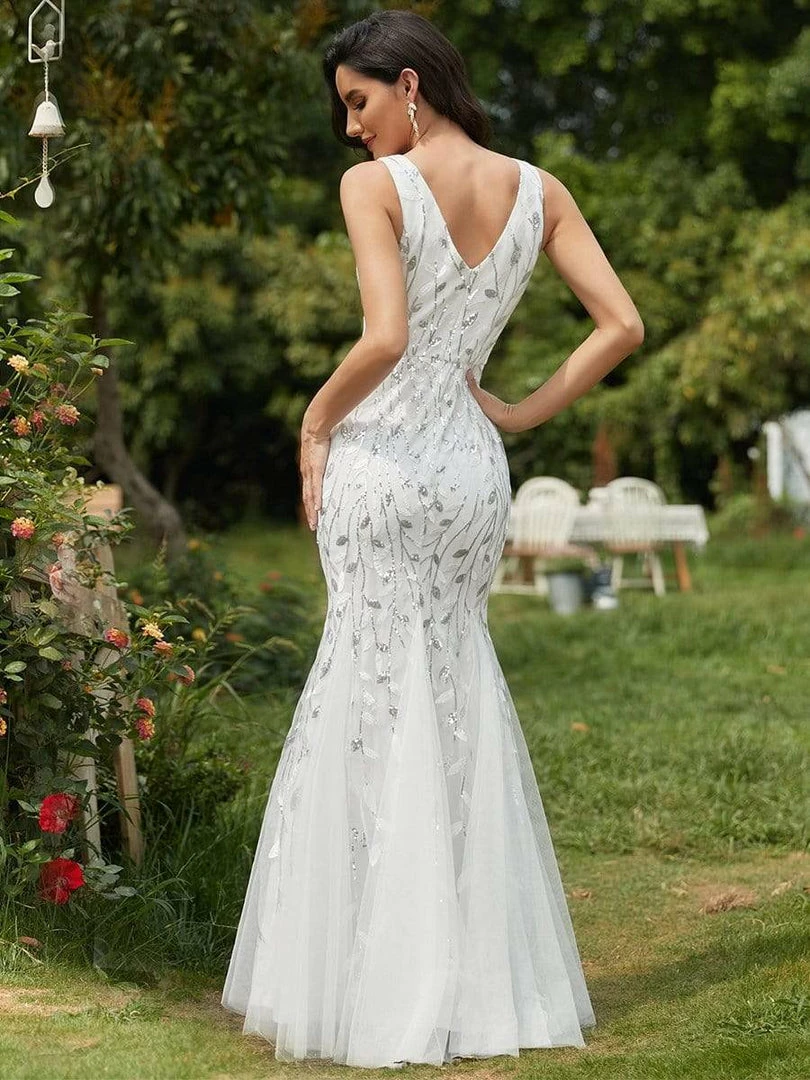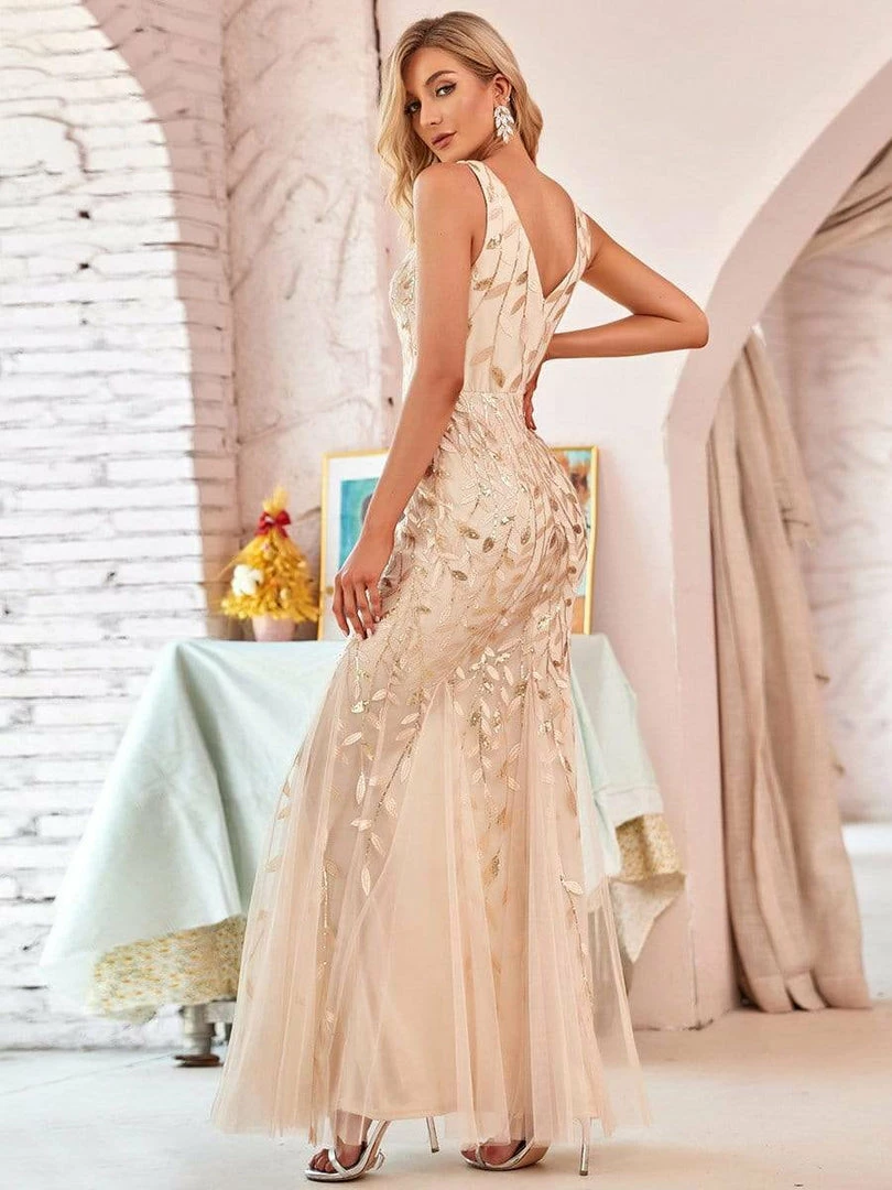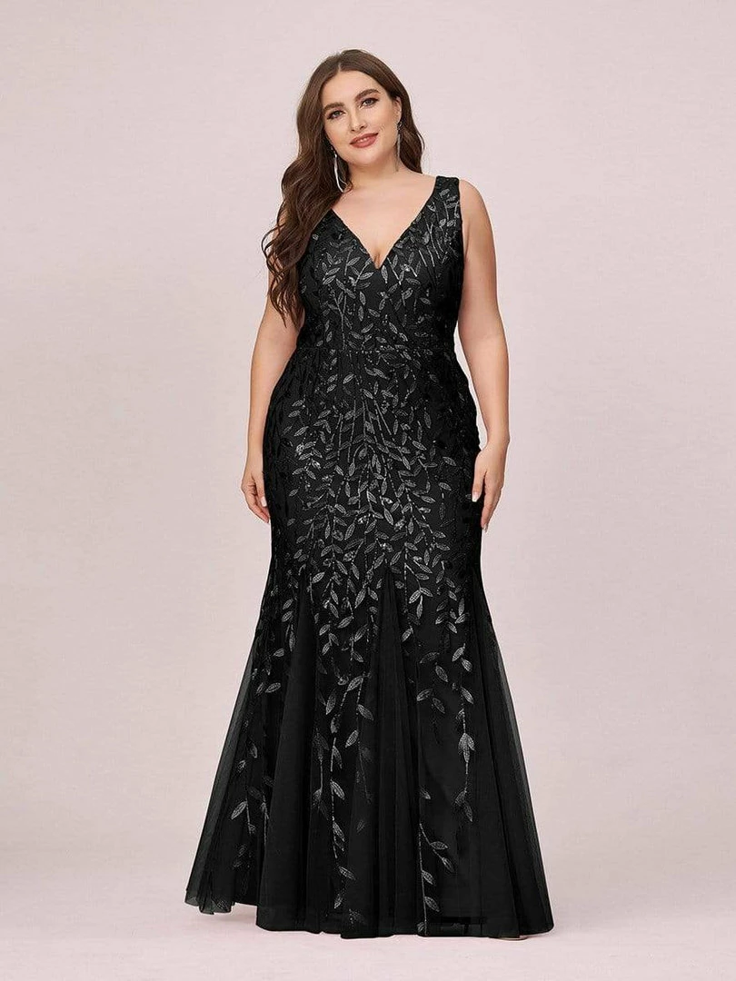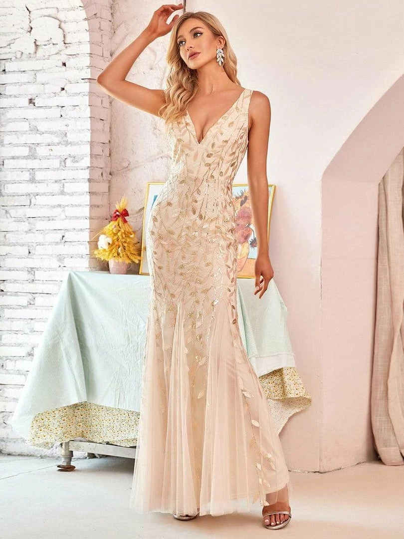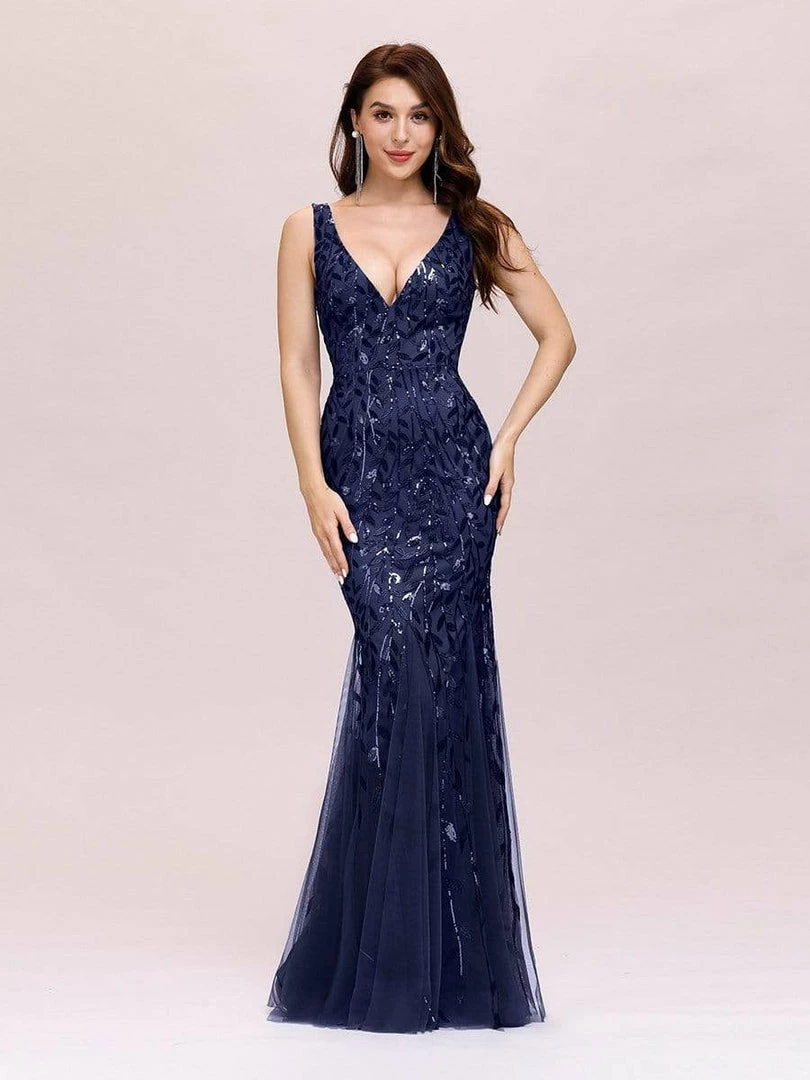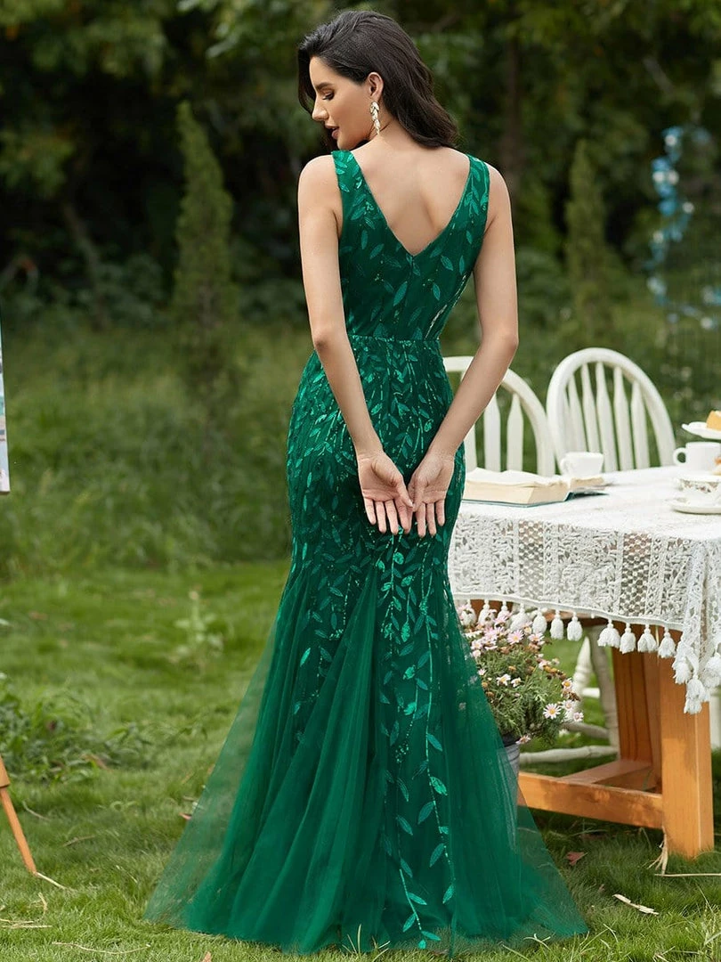 This sexy sequined tulle evening dress features a deep V neckline and fishtail skirt, the shimmery leave design also adds a romantic vibe. It is a perfect choice for people who are looking for an elegant look, but its delicate details add just enough flair to show your taste. Really perfect for evening party, cocktail, prom, homecoming, graduation, weddings, and any other formal affair! This elegant mermaid evening dress has some colors on sale, like burgundy, navy blue, black and more. So the overall price will vary from range to range.