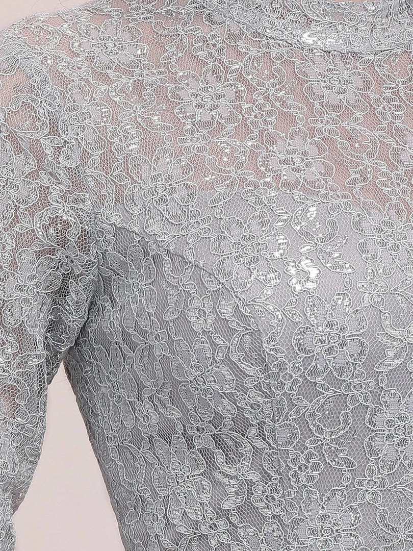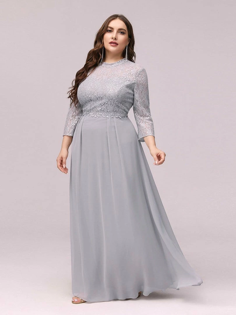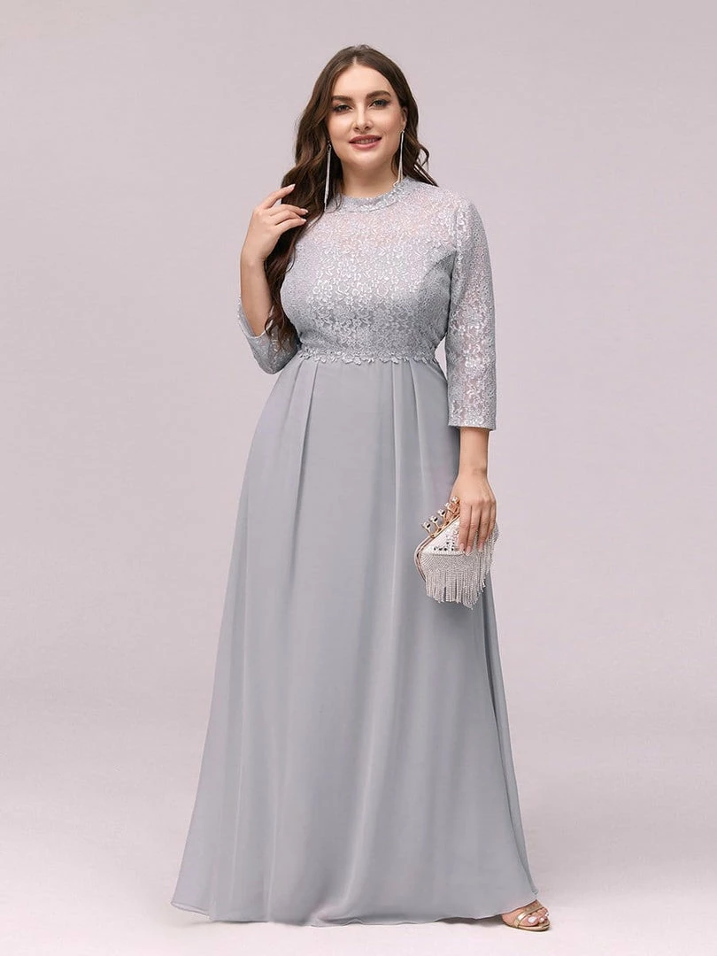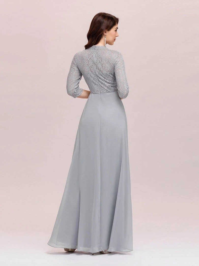 Look like an elegant princess by wearing this elegant Chinese standing collar chiffon evening dress for ladies. The upper part of the chiffon evening dress is made of beautiful silver lace clothe and is quite eye catching. This lace chiffon evening dress features a round neck and half sleeves. The A-line silhouette also helps to accentuate the body shape of the wearer.