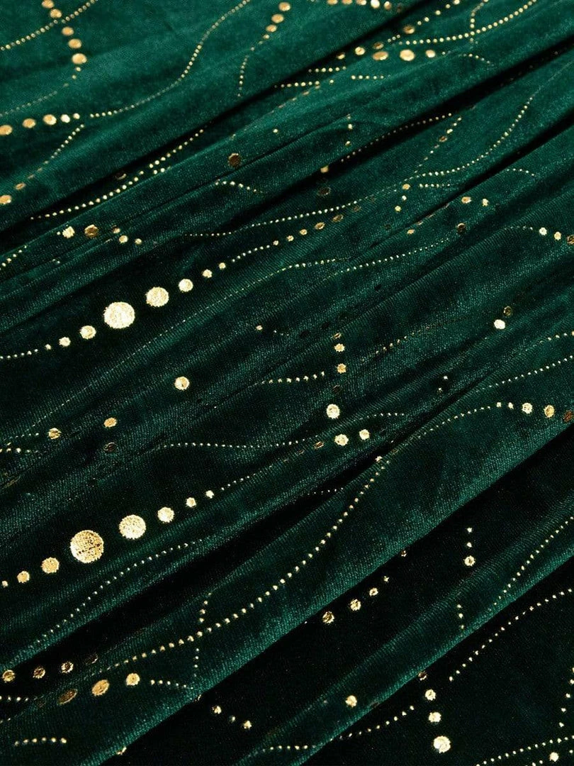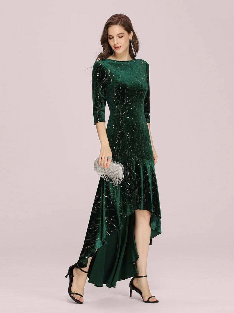 This high low velvet evening party dress is one of the most beautiful dresses. The dress is made of velvet fabric with gold stamping which makes the dress look luxurious and high-end. It features a round neck and three quarter sleeves. This dress also features high low hemline and fishtail silhouette. Wear this dress and look simple yet elegant!
