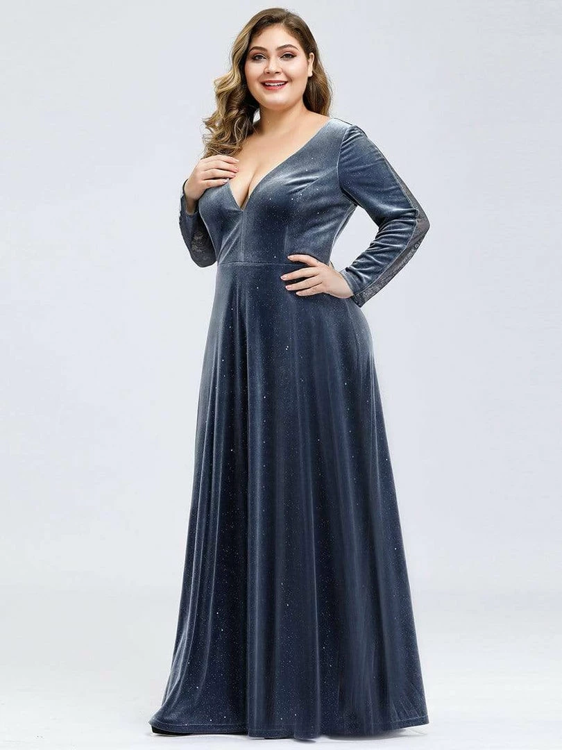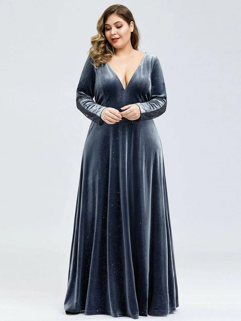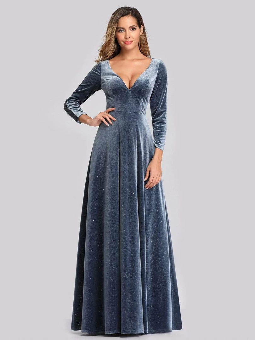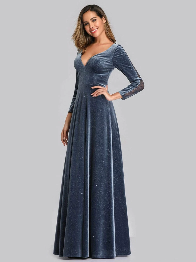 This velvet evening dress features a deep V neckline and long sleeves. What’s better, the shimmering powder and the sheer lace in the sleeves and back add just enough flair to show your taste. This long sleeve velvet evening dress is perfect for winter occasions and show your timeless elegance.