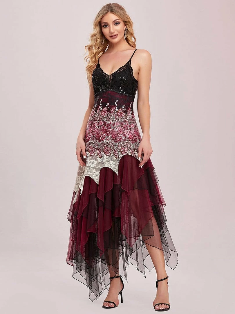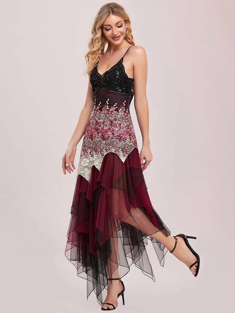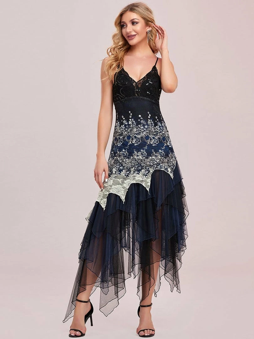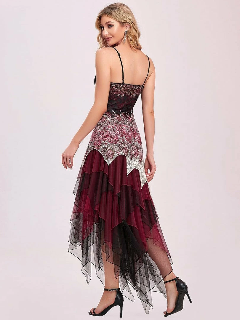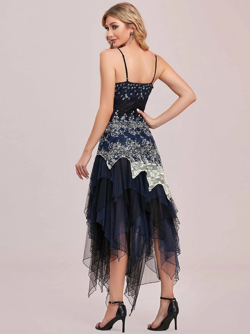 Featuring a V neckline with gorgeous lace trim and glittery beading, adjustable spaghetti straps and asymmetric hem, this stylish sexy asymmetric prom dress is sure to make a stand out at your next event! Perfect for evening party, cocktail, prom, homecoming, graduation, weddings!